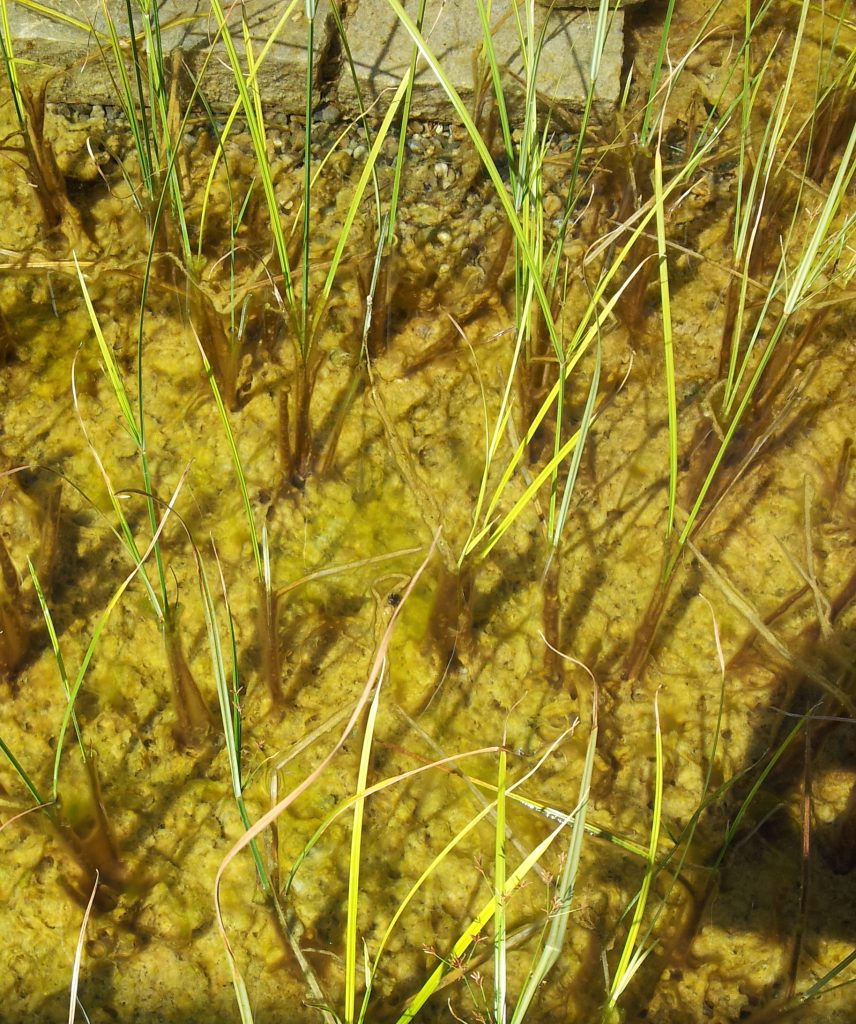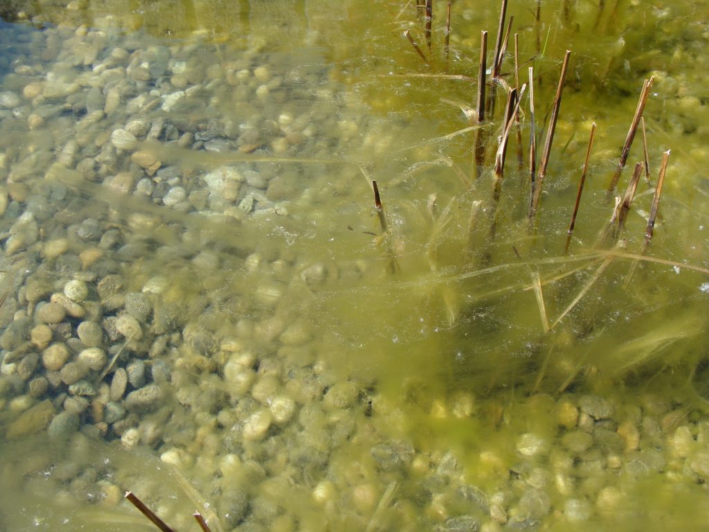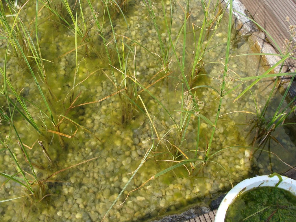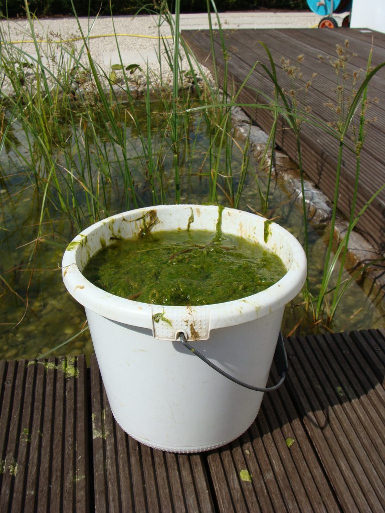 Der Schwimmteich war seit Jahren so sehr veralgt, dass er zum Schwimmen nicht genutzt wurde. In den wärmeren Monaten bildeten sich innerhalb weniger Tage/Wochen teilweise einmeterlange Stabalgen.