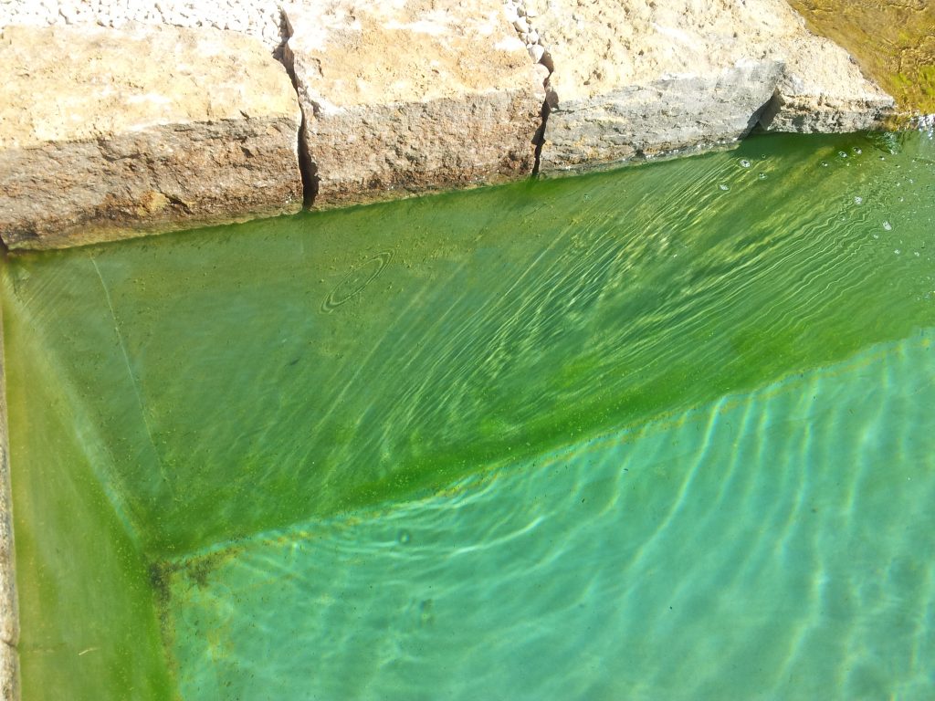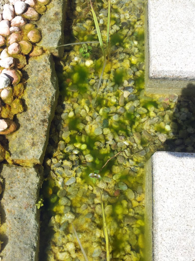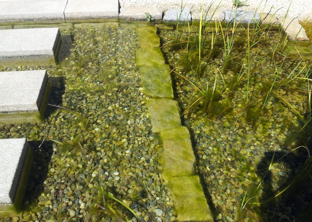 Alle Anpflanzungen, Steine und Wasserwege waren mit Biomasse, Algen oder einer starken Verkrustung überzogen.