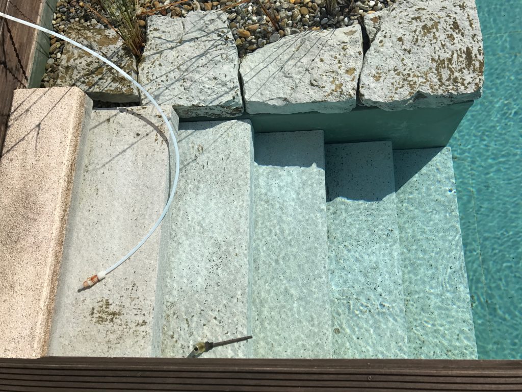 Nach zirka drei Monaten war das gesamte Wasser im Schwimmteich klar, die Algen abgebaut und hartnäckige Verkrustungen abgelöst oder aufgeweicht. Auch die Steine, an denen das Wasser nur vorbeifloss, wurden wieder weiß (siehe Bild 4/6).