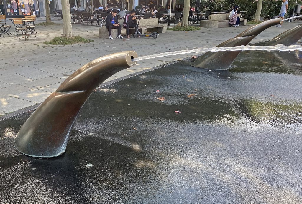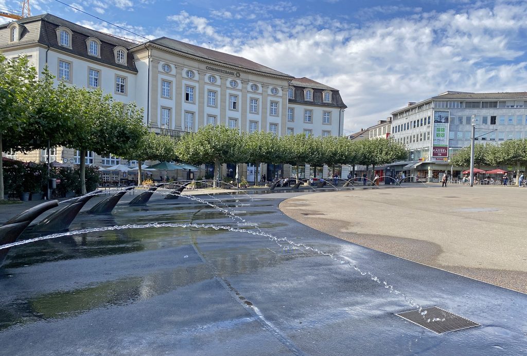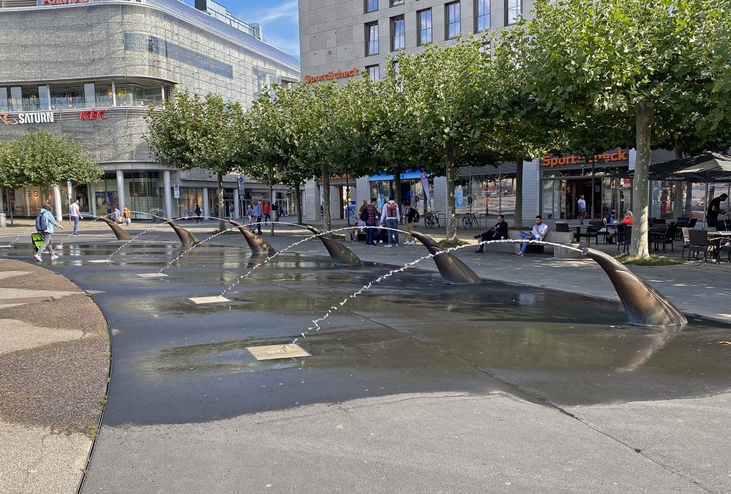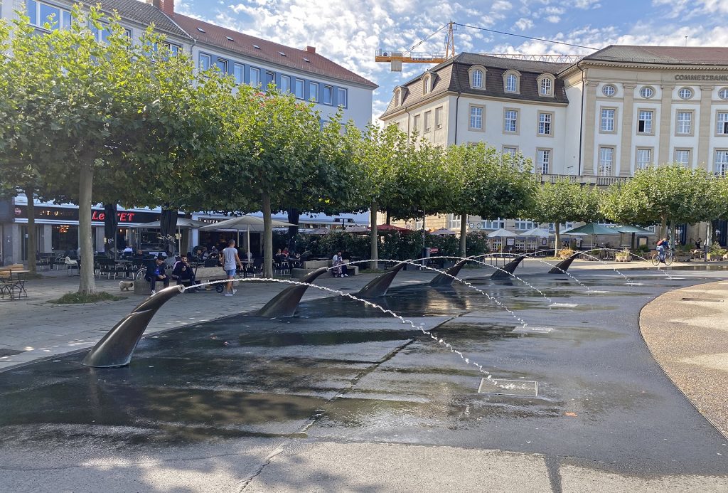 Der runde Königsplatz im Zentrum von Kassel ist der geographische Mittelpunkt der Stadt. Seit 2005 umstehen ihn 36 Wasserspeier aus Bronze, die wegen einer technischer Erneuerung 2019 ausser Betrieb genommen wurden.