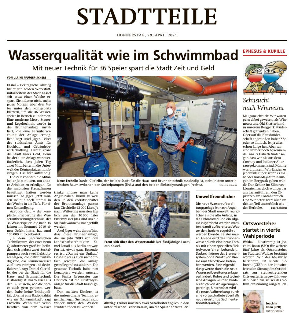 Nach einer umfangreichen Planungsphase durch die Firma Wild Engineering GmbH wurden die einzelnen Anlagensegmente speziell für den Kassler Brunnen angepasst und in den unterirdischen Schacht in den begrenzten Raum eingebaut. Zusätzlich wurde eine Fernüberwachung der Anlage installiert.